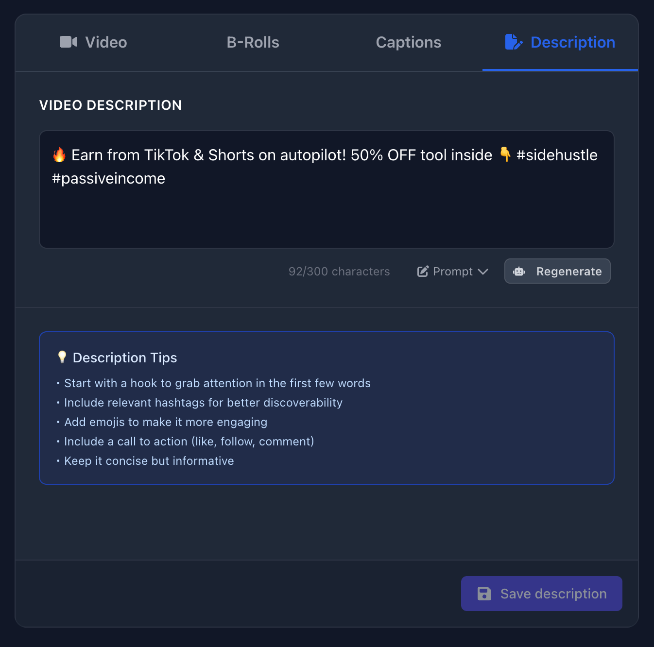 AI generates compelling video descriptions with the right keywords and trending hashtags. Optimized for each platform—YouTube, TikTok, and Instagram—to maximize discoverability and reach.